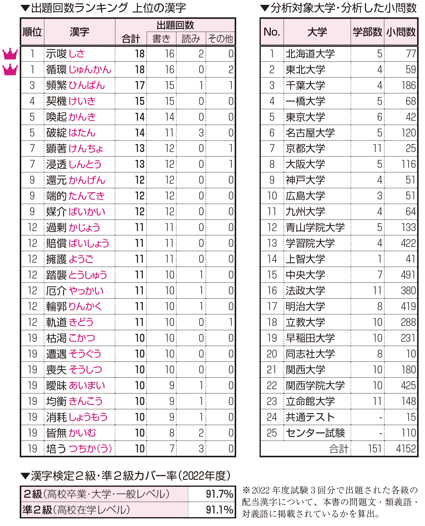 共通テスト(+センター試験)×25年分,主要23大学151学部×10年分の入試問題合計4,152問を分析。膨大な漢字(熟語)の中から,入試に必須の漢字を厳選! 頻出の漢字を「最短距離」で身につけることができます。