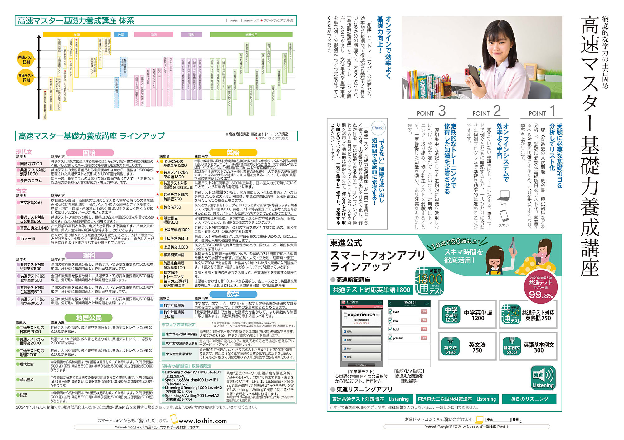 高速マスター基礎力養成講座は「知識」と「トレーニング」の両面から、効率的に短期間で基礎力を徹底的に身につけるための講座です。大きく分けると、「高速暗記講座」と「高速トレーニング講座」の2つがあり、文法事項や重要事項を単元別・分野別にひとつずつ完成させていくことができます。