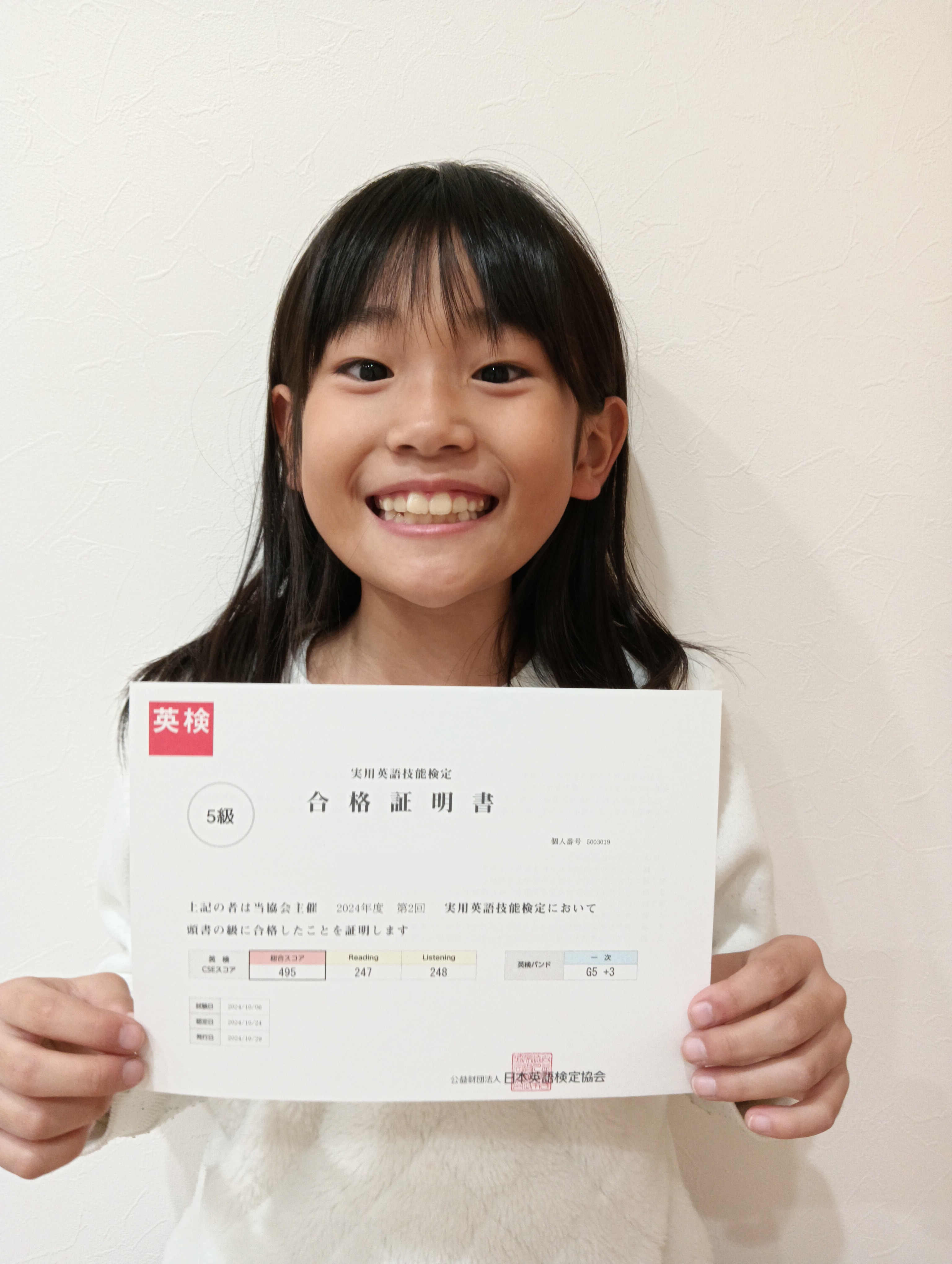 とても難しくて、何度も落ちていたので、受かったと知ったときはすごく嬉しかったです。英語塾・中学校の最後の年に取れて安心しています。勉強している中でしんどい時もありましたが、諦めなくてよかったと思っています。