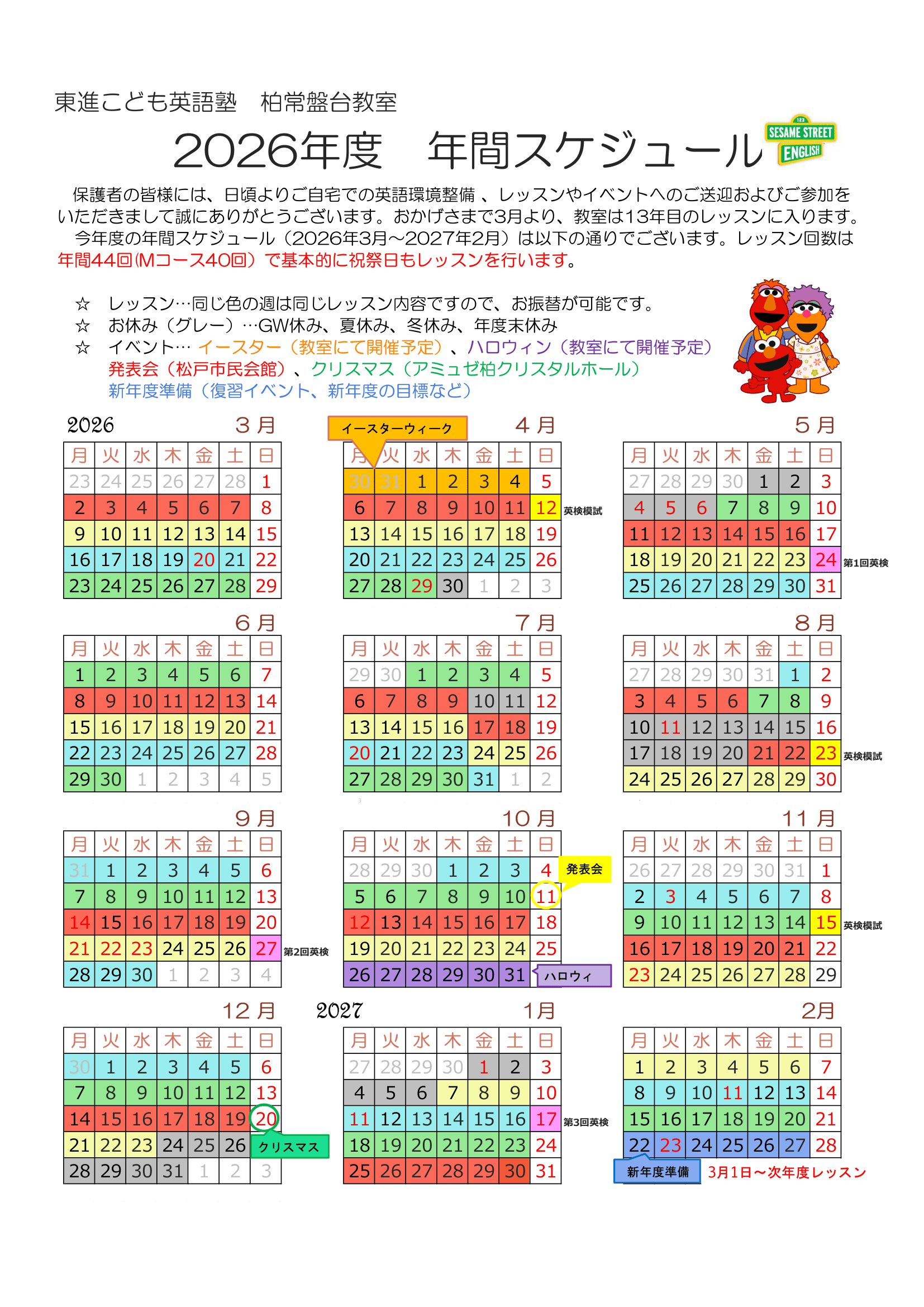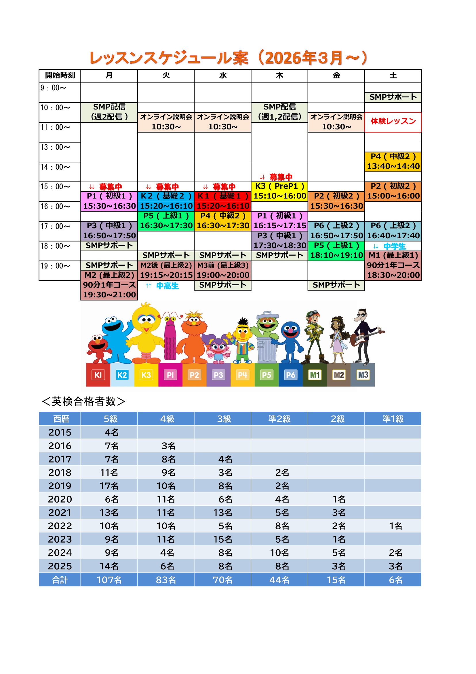 おかげさまで、柏常盤台教室は2025年11月に開校12周年を迎えました。これまで英検5級に合格した生徒は100名を超え(他級の合格者数は以下をご参照ください)、準1級に合格した生徒(14歳~)も6名に達しました。短期間でこれらの成果を上げられたのは「週1回のレッスンは単なるサポートに過ぎない」という教室の考えに保護者の皆様がご賛同くださり、多大なるご協力をいただいた賜物です。カリキュラムの最初に、学校では教わらないフォニックス(文字と音の関係性)の基礎から上級まで(K2~P2コース)を徹底的に学び、しっかりと声に出して読める力、そして自信を持って英語を話せる力の土台を身に付けます。そして土台が固まってきたところで、英語で算数、理科、社会(P3~)更には英語で文法(P5~)も学びながら、どんどん知識を積み上げ少しずつアウトプットしていきます。しかし土台つくりも積み上げも週1回のレッスンにご参加いただくだけでは不十分で、以下ご家庭での学習システムをフルにご活用いただくことで、最上級コース(Mコース)への進級に足りる確かな力(準2級~)が身に付くことが分かりました。