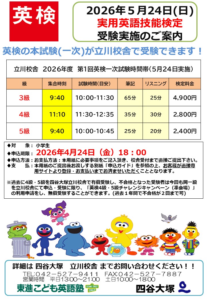 ページの下部に四谷大塚立川校舎での通常レッスン時間割がございます。立川校舎までお電話(042-527-9411)にてお申込みください。