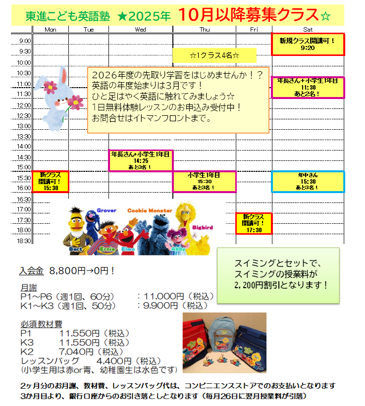 また、耳の成長が著しいこの時期に、たくさん英語のシャワーを浴びることで、「聴く力」が付いてきます。