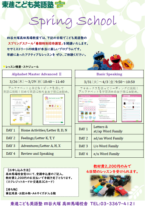 高田馬場校舎では,3月末~4月上旬に,スプリングスクールを開講いたします!