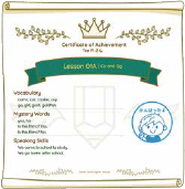 各レッスンのすべてのクイズとテストを行いレッスンを無事に修了すると、レッスン修了書を表示できるようになります。レッスン修了書には各レッスンで学んだ大切な言葉や表現の一覧が記載されています。お子さまは修了書を見て「できた」を再確認することができます。
