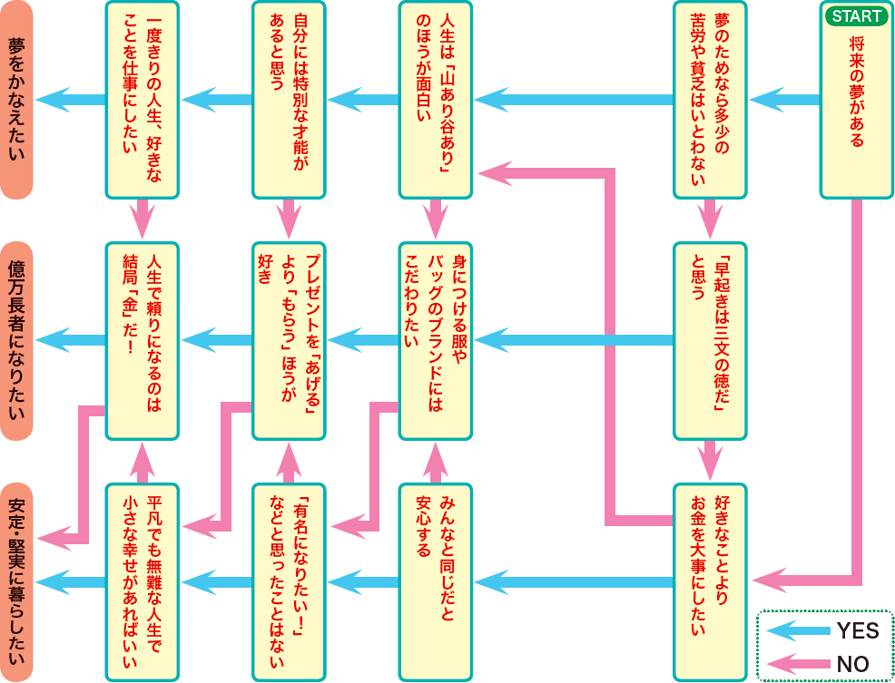 皆さんは、働くことや仕事に対してどのように考え、また働くことに対してどのような希望を持っていますか?下のチャートから考えてみましょう。STARTから始めて、YES・NOでチャートを進んでいってください。左端に書かれているのが、皆さんが仕事に求めるものです。
