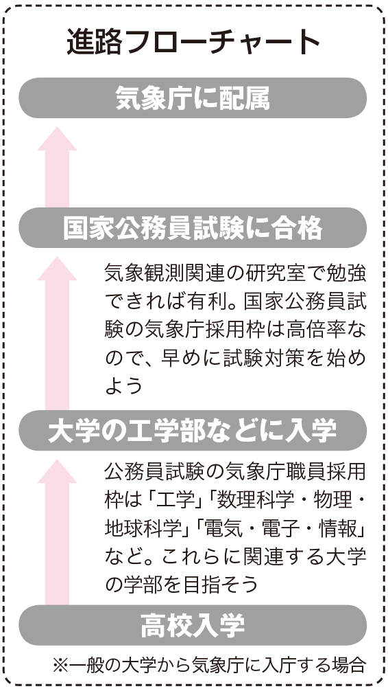 気象庁職員は国家公務員です。国家公務員試験「総合職」(院卒者・大卒程度)や「一般職」(大卒程度)を受験し合格する必要があります。総合職は将来の気象庁の指導者となる人材で、「工学」及び「数理科学・物理・地球科学」の試験区分から採用されます。一般職は「行政」「物理」「電気・電子・情報」「化学」「資源工学」の試験区分から採用され、全国の地方気象台などに配属されて予報や観測などの業務を担当します。「行政」採用者は総務・人事・会計などの業務に携わります。