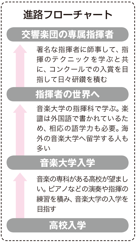 オーケストラや合唱団の演奏会などで、楽器演奏者に音の「入り」や「切り」の指示、テンポ・強弱など演奏の指示を与え、演奏者全体をまとめる仕事です。演奏会本番の指揮だけでなく、リハーサルで音楽のイメージを演奏者に伝えることも重要な仕事です。交響楽団などに所属している指揮者は、楽団による音楽演奏の総責任者という要素も強く、プロデューサーとしての資質も必要です。