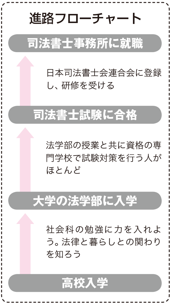 司法書士を目指す人の多くは、大学に通いながら資格の専門学校などにも通って資格試験の勉強に励みます。大学は法学部に進学して法律について学んでおくと有利です。高校生のうちは社会科に力を入れ、法律と私たちの暮らしとの関わりに興味を持ちましょう。