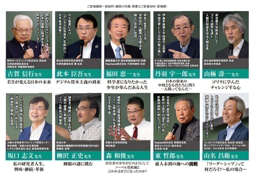 日本を牽引する各界のトップリーダーによる講演会と、ワークショップがセットになった東進だけの特別授業。トップリーダーの知見を学び、視野を広げ、夢を深めていきます。この講座がきっかけで将来の夢が固まったと、猛烈に勉強し始める生徒が多くいます。2014年から実施し、これまで各界を代表する70名以上の方にご登場いただきました。