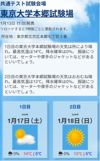 東進ハイスクール・東進衛星予備校(以下、東進)を運営する株式会社ナガセ(本社:東京都武蔵野市 代表取締役社長 永瀬昭幸)は、頑張る受験生を応援するため、「共通テスト 全 650 試験会場のお天気」サイトを公開しました。大学入学共通テストが実施される 2026 年 1 月 17 日(土)・18 日(日)の全 650 試験会場の天気や気温、服装アドバイス等をまとめた便利サイトです。簡単・スピーディーに最新情報を確認できます。