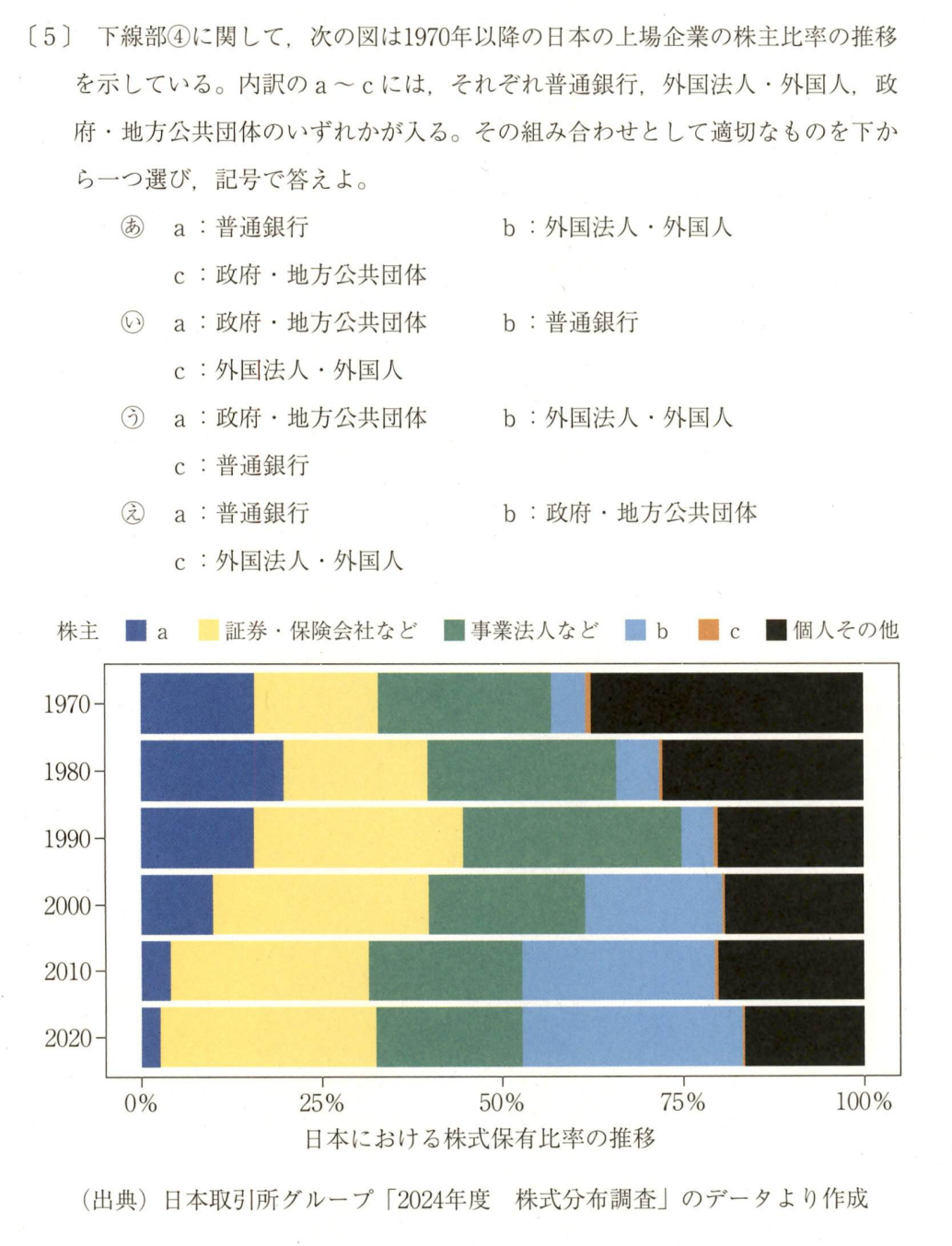 2024年発表の「株式分布調査」に基づいた、1970年から2020年にかけての「株式保有比率の推移」に関する最新のグラフ読解が出題された。銀行による株式持ち合いの解消や、外国法人・外国人の保有比率急拡大といった、日本経済の構造的変容を最新データから実証的に捉える力が問われている。