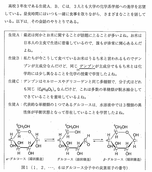 Iではナトリウムを題材に、イオン化エネルギー、金属結晶と密度計算、さらに電気分解が問われた。IIではリンを中心に周期表、性質、リン酸を用いた燃料電池の計算と電解槽が問われた。IIIは芳香族化合物に加え、フルオレセインを絡めた有機分野が問われた。IVは糖の分野に関して、例年とは異なる会話形式の問題文が提示された。