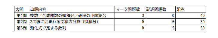 東京理科大学創域理工学部の今年度数学は、大問3題構成で、第1問が穴埋め(マーク)中心、第2問・第3問が記述中心の形式だった。第1問では、整数、指数や三角関数を含む微積分、サイコロの期待値計算といった小問がまとまって出題された。第2問は、2曲線で囲まれる面積や極限といった微積分が出題された。第3問は、漸化式で定まる数列に関する典型的な大問であった。