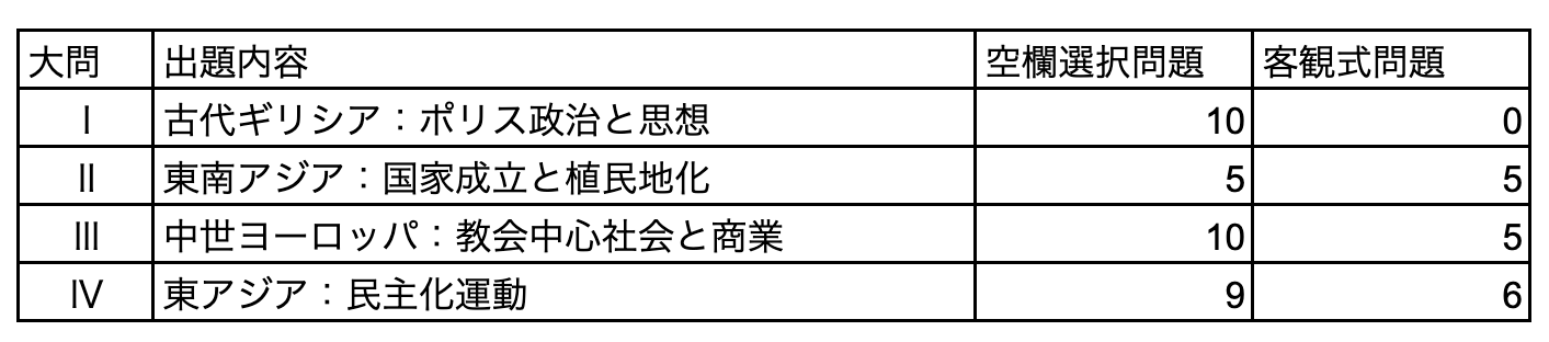 各大問を見ても、古代ギリシアではポリスにおける政治制度と思想の形成、東南アジアでは国家形成と植民地支配の進展、中世ヨーロッパではキリスト教会を軸とした社会と商業活動、現代東アジアでは民主化運動と政治体制の変化が扱われており、いずれも「社会の枠組みがどのように成立し、どのように変化してきたのか」という共通の視点で整理できる内容となっている。