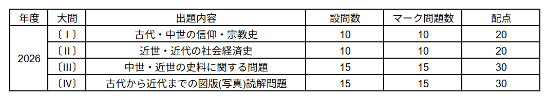 関西大学の一般入学試験(全学部日程)の日本史は、高等学校の教育課程修了程度の知識・技能、思考力・判断力・表現力等の能力及び主体的な態度を十分に備えている受験生を選抜するための試験である。今年度も全問マークセンス方式で、第1問で古代・中世の信仰・宗教史、第2問で近世・近代の社会経済史、第3問で中世・近世の史料に関する問題、第4問で古代から近代までの図版読解問題が出題された。昨年度と異なる傾向としては、昨年度出題されなかった写真の史料をもとに様々な時代区分やテーマについて問う総合問題が復活したことが挙げられる。昨年度導入された新課程で益々重視される、多面的・多角的な視点から歴史的理解を問うことを意識した出題形式といえるだろう。