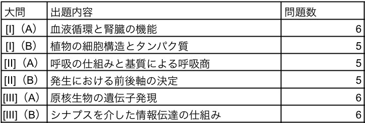 関西大学生物では例年このような傾向が見られるものの、一部の分野が大問間で重複することもあった。今年はこの傾向がさらに顕著になり、問題ごとに必要な引き出しの位置が大きく異なっている。これらに対してどれだけ頭を切り替えて問題を解けるかが高得点の鍵であった。