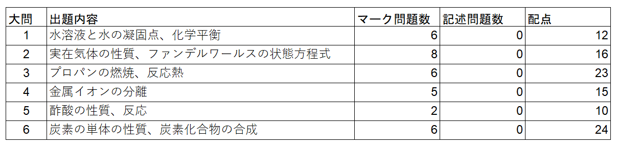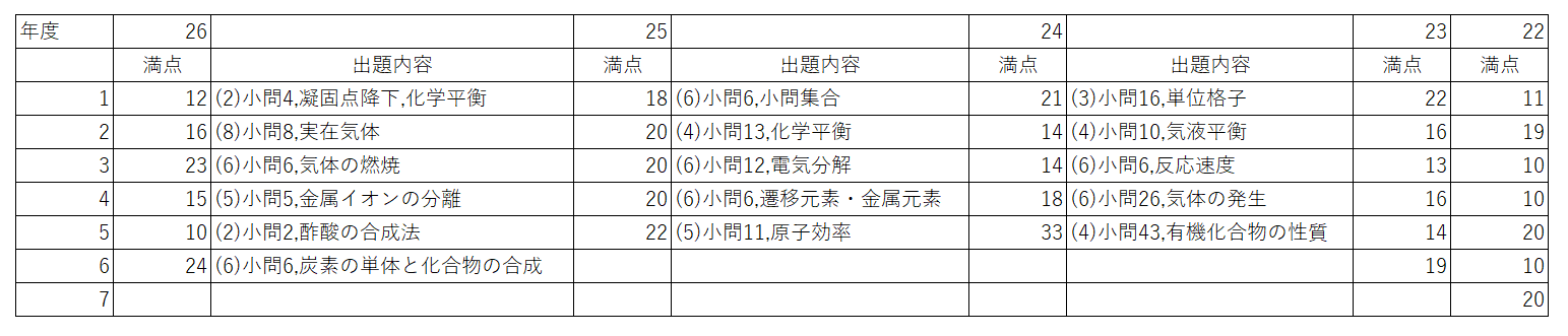 2024年度および2025年度は、問題冒頭の文章に空欄が多く、当てはまる語句を一つずつ選択する問題が多かったものの、2026年度では、当てはまる語句の組み合わせを選択する問題が増加するなど、大問一つあたりの問題数は全体的に少なくなり、全体の問題数も減少傾向である。2025年度の大問2で出題されて化学平衡に関する問題に関して、2026年度では凝固点降下と併せて大問1で出題された一方、2026年度の大問2と大問3はともに気体の性質に関する問題であった。大問数が5から6に増加したことで、より多くの分野の問題が出題されたが、全ての分野の問題数が減少しているわけではないことにも注意が必要である。
