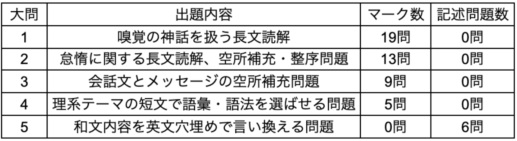2026年度の慶應義塾大学理工学部第5問では、2023年度以降出題され続けていた記述式の和文英訳問題が、穴埋め形式の和文英訳問題に変更されて出題された。