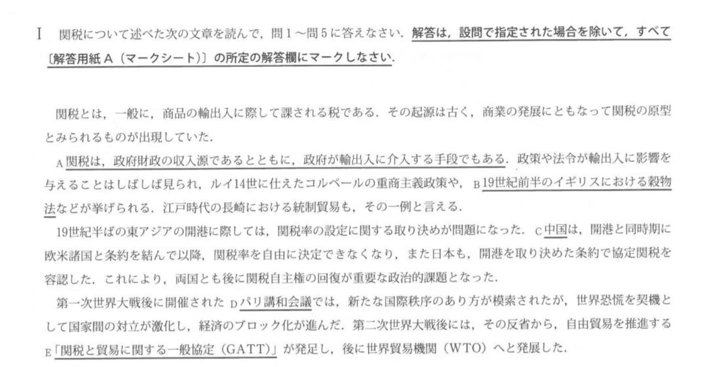慶應義塾大学経済学部の世界史では、大問Ⅰで関税がテーマとなった。