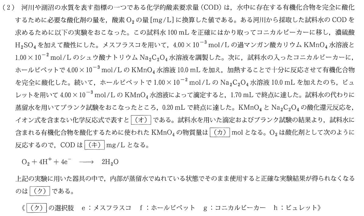理工学部化学 水質の汚染度合いを示す指標として用いられる『COD』に関する問題が出題!