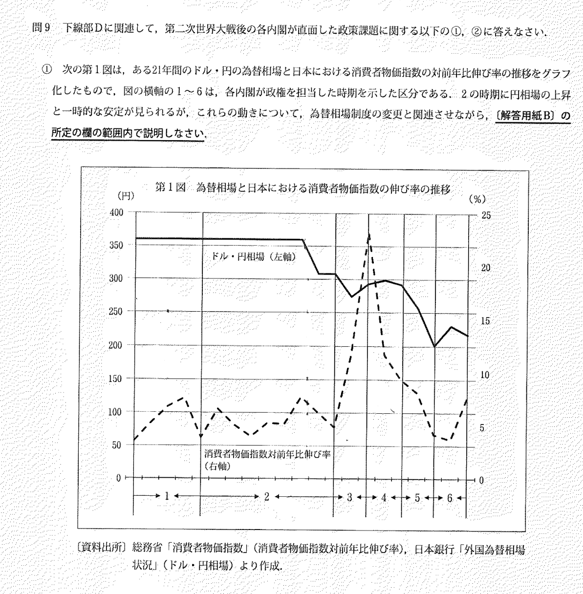 慶應大学経済学部日本史大問IIでドル・円為替相場と消費者物価指数のグラフを活用して、当時の内閣のとった経済政策や物価の動向が政治に与えた影響などを問う問題が出題された。これは、近年の1ドル150円代の円安やそれに伴う物価高という実際の経済状況を意識した出題であると考えられる。