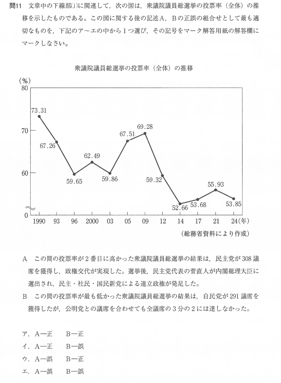 大問Ⅰの問11では、1990年から2024年までの衆議院議員総選挙における投票率の推移グラフが出題された。2026年2月8日に投開票が行われた第51回衆院選の投票率(56.26%)が、戦後3番目に低かった前回2024年(53.85%)を上回ったという最新の時事事実を背景に、過去の政権交代時(2009年)や戦後最低(2014年)のデータとの整合性を問う高度な資料読解が求められている。