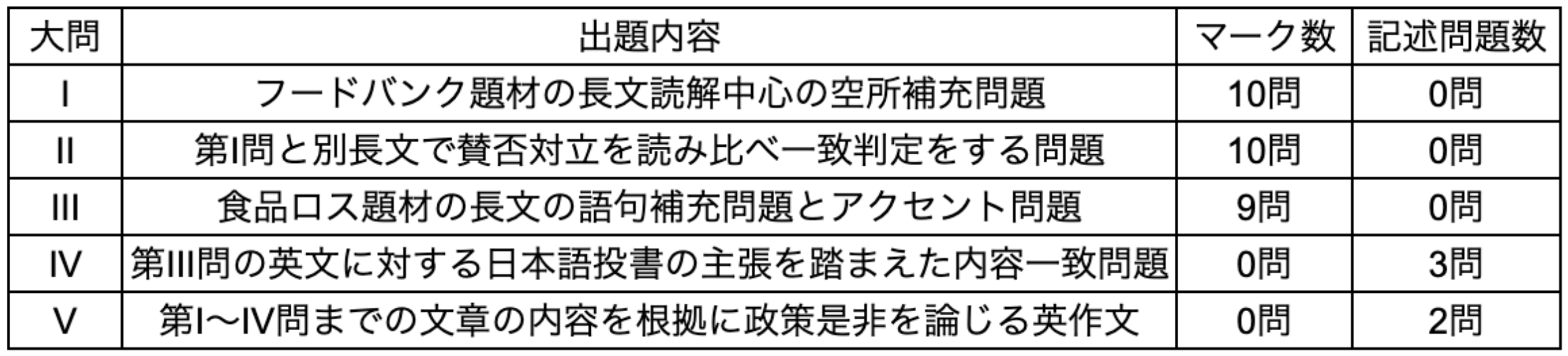 2026年度も大問5題構成を踏襲し、フードバンクをめぐる議論を軸に、第I問でフードバンクを題材にした長文の空所補充、第II問で別の長文を読み、両者の立場を比べる一致判定まで求める構成となっている。第Ⅲ問は食品ロスを扱う長文で、語句補充に加えて2024年度以来の出題となったアクセントの設問も含まれ、読解処理と基礎知識を同時に点検する作りである。さらに第Ⅳ問では、第Ⅲ問の英文に対する日本語の投書を読ませ、その主張を踏まえて英語の設問に答えさせることで、日英の情報を突き合わせる照合力を問う。最後の第Ⅴ問は、提示された論点に基づいて政策是非を論じる自由英作文で、反対意見への言及と反論を条件にするなど、単なる意見表明ではなく「本文根拠に立つ議論」を要求している。