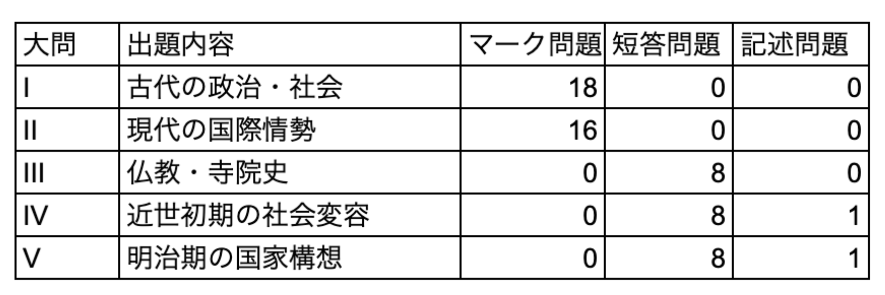 大問Ⅲは文化史で、延暦寺や建長寺など「元号を冠する寺院」の興亡をテーマとした。大問Ⅳ・Ⅴは、例年出題されている史料読解問題である。大問Ⅳでは豊臣秀吉の身分統制令などを読み解き、兵農分離の実態を説明させ 、大問Ⅴでは大久保利通の意見書から、民主制の長所・短所に対する大久保の評価を論述させるなど、史料の文脈を正確に把握し、論理的に要約する記述力が試された。