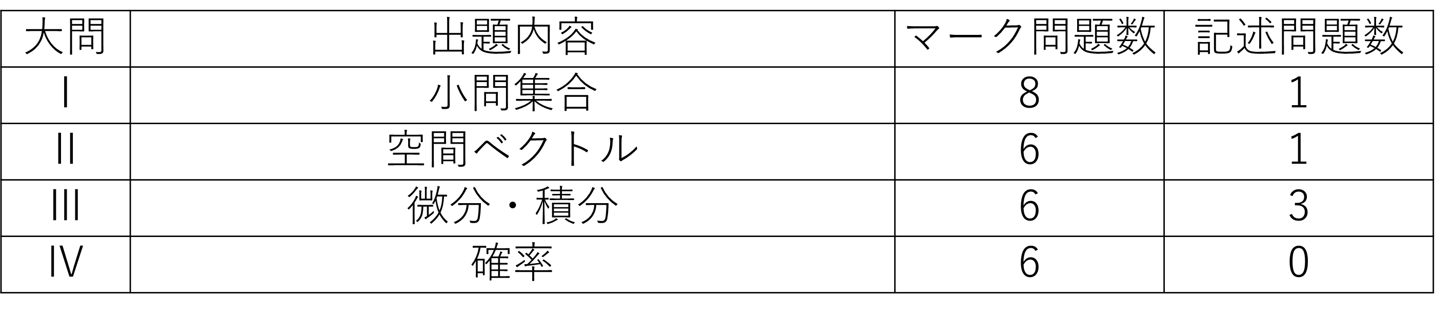 今年度の慶應義塾大学商学部の数学は、第1問が確率や数列、命題などを含んだ小問集合、第2問が内積やベクトルの長さを扱った空間ベクトルの問題、第3問が3次関数と接線を題材にした微分・積分の問題、第4問が8枚のカードを題材にした確率の問題のように、頻出の分野である確率や数列、ベクトル、微積分が出題された構成であった。