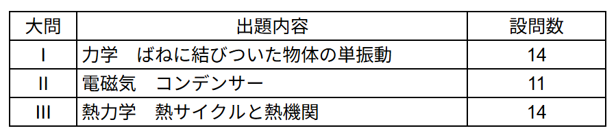中央大学入学試験の物理は、物理学の基本知識と問題文中のヒントを組み合わせ、複雑な状況を論理的に考察する力を問う問題が出題される。今年度は、第一問にばねで連結された物体の運動を扱った力学、第二問にコンデンサーに関する電磁気、第三問に熱サイクルと熱機関を題材とした熱力学が出題された。