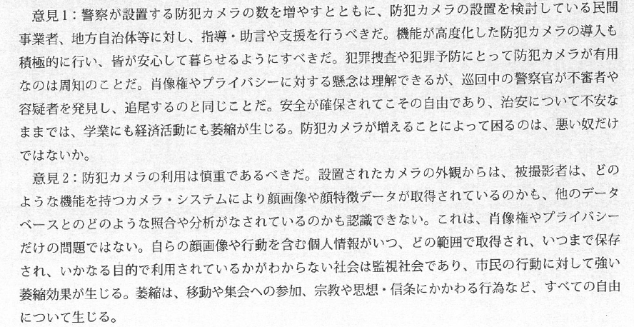 慶應義塾大学法学部の小論文では、安全・安心とプライバシー、特に防犯カメラを題材に、提示された複数の意見を踏まえて討論形式で自分の見解を述べる問題が出題された。