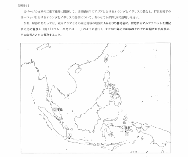二つ目の論述問題は、17世紀におけるオランダとイギリスの覇権争いについて、東南アジアの地図に示された各都市・地域に言及しつつ240字以内で記述させるものであった。歴史的事象を地理的条件と関連付けて説明できるかを問う総合的な応用問題であり、実用可能な知識を重視する大学側の姿勢が示された設問であった。