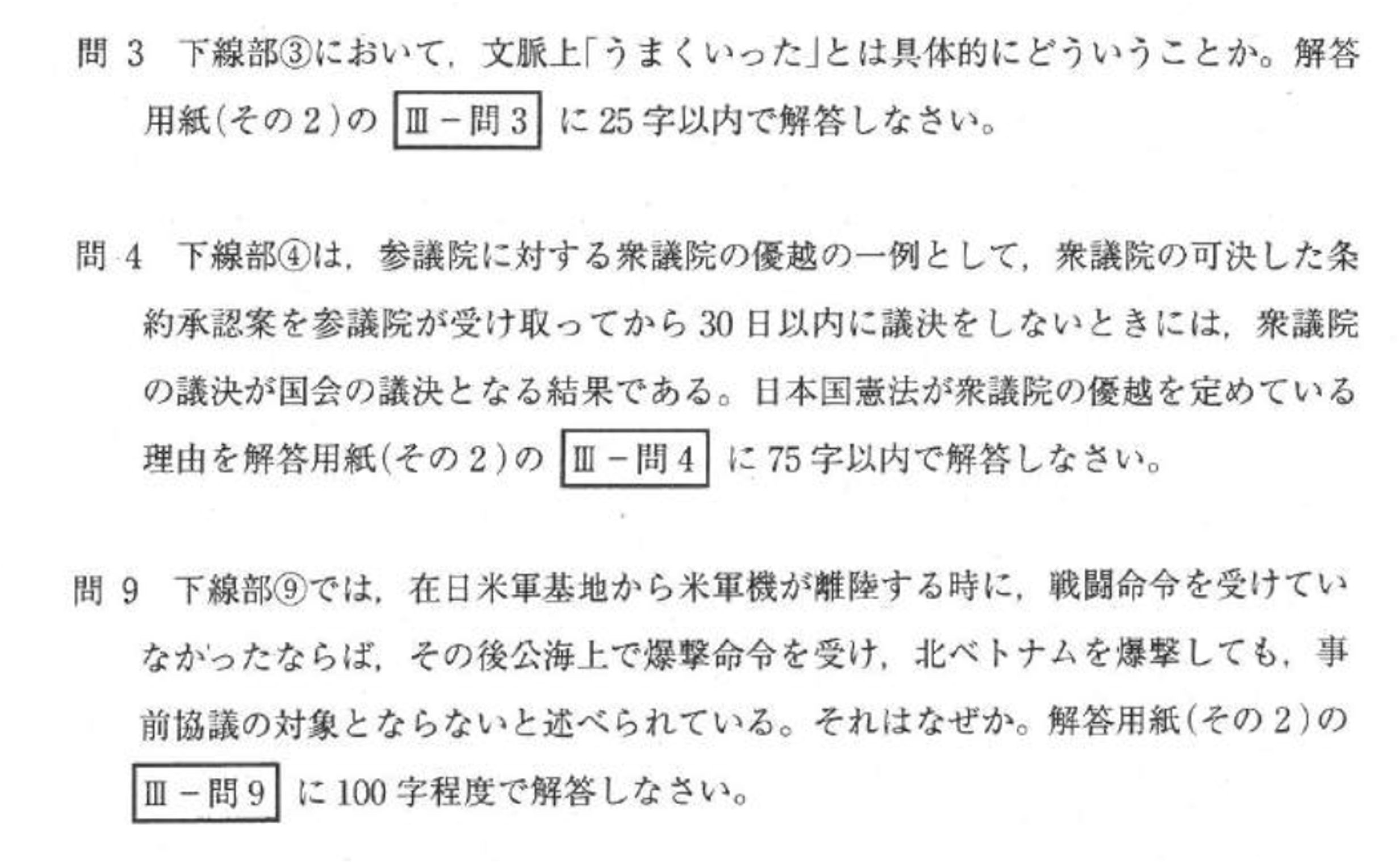 第3問では、戦後日本の安全保障体制、とりわけ安保条約を中心とする議論が展開された。安保条約の成立過程やその制度的枠組みに関わる設問が出題され、統治制度や憲法に関する理解を前提とした記述問題も見られた。