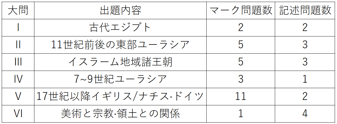 注目すべきは、〔Ⅵ〕の美術に関する出題である。例年同様に美術作品を扱う形式であったが、今年度は作品と宗教観・領土意識との関連性に着目させる内容であり、政治史と文化史を横断的に結び付けた構成となっていた。また、イェルサレムやキリスト教を題材とする作品が取り上げられており、近年不安定化が続く同地域の情勢を意識した出題であるとも考えられる。