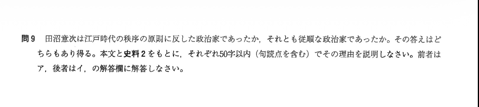 早稲田大学教育学部の日本史では、大問Ⅲで田沼意次について、異なる二つの評価に基づいた記述がそれぞれ求められる新形式の論述問題が出題された。新課程である日本史探究において、思考力が重視されていることを受けた出題であると思われる。
