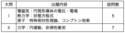 早稲田大学教育学部の物理では、知識力と計算処理能力の両方が問われる問題が出題されている。過去2年間は大問3題構成であったが、今年度は大問2題構成へと変更された。大問1では原子・電磁気・熱力学といった幅広い分野から、基礎知識を問う問題や新たな考え方を導入する問題が出題され、大問2では円運動から放物運動、さらに連続衝突へと展開する力学分野の深い理解を問う問題が出題された。