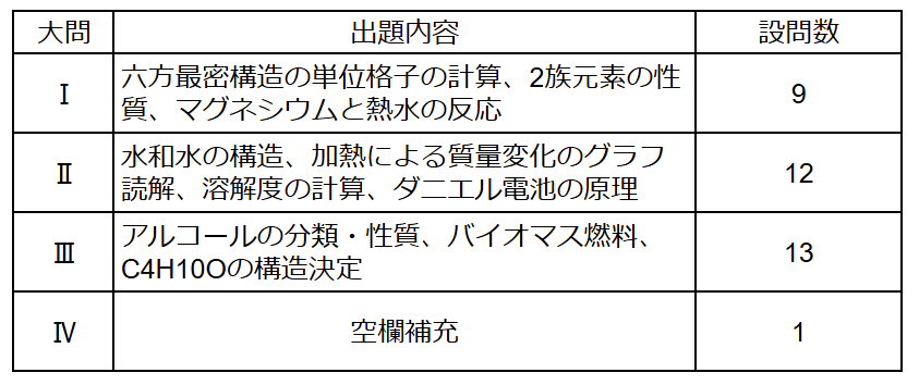 第I問ではマグネシウムの六方最密構造に関する単位格子の計算、第II問では硫酸銅(II)五水和物の加熱による質量変化のグラフ読解、第IV問では超臨界状態やコロイド、化学平衡など幅広い知識が問われた。