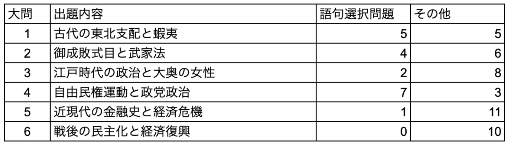 その他の大問も、大問1は古代ヤマト政権による東北支配と蝦夷の平定の過程を問う内容が出題され、大問5は商学部での頻出テーマである国立銀行の設立から松方デフレや昭和金融恐慌に至る近現代の金融史を通史的に扱っている。例年通り、古代から現代まで幅広いテーマを取り上げた問題であったと言えよう。